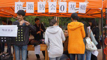 求索广场笼罩在一阵火热的气氛中,一排排整齐的黄色帐篷,五彩斑斓、绚丽夺目的宣传单和海报,各种各样新奇古怪又可爱的装饰品,忙忙碌碌的工作人员和踊跃报名的学生,一切都那么的吸引人眼球。还没进入活动场地,宛转悠扬的笛声和箫声便触人心悸。这美妙的乐音吸引的不少人来笛箫社团。有学生好奇又兴奋地问道:“完全不懂的可以加入吗?”“零基础,都可以的。”会长耐心又热情地讲解道。听着会长的细心讲解,学生们都争相的加入了笛箫协会。