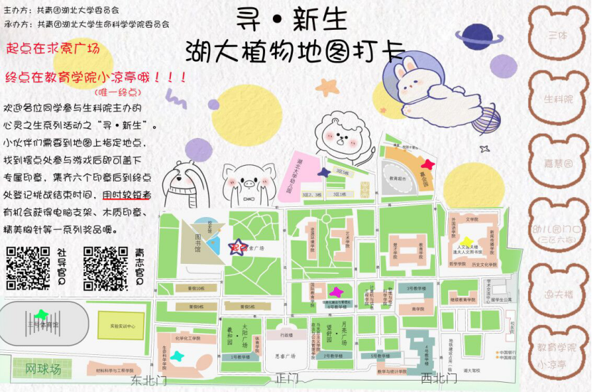 活动以“湖大地图打卡”形式展开,参与的同学们需要完成包括“与植物合影”,“心理知识竞答”,“口红色号找不同”等活动形式。同时,用时较短的参赛者可以获得精美礼物。