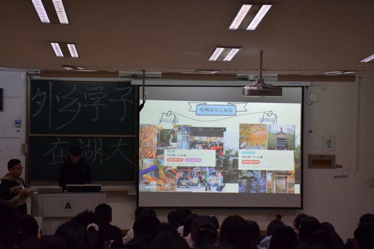 了解一个城市,当然少不了“吃喝玩乐”,中山公园,园博园,欢乐谷或是动物园和科技馆,游玩路线被一一列举,介绍给在场的学子们;粮道街,一元路,江汉路各色各类特色小吃同样勾起在场学子们的好奇心。