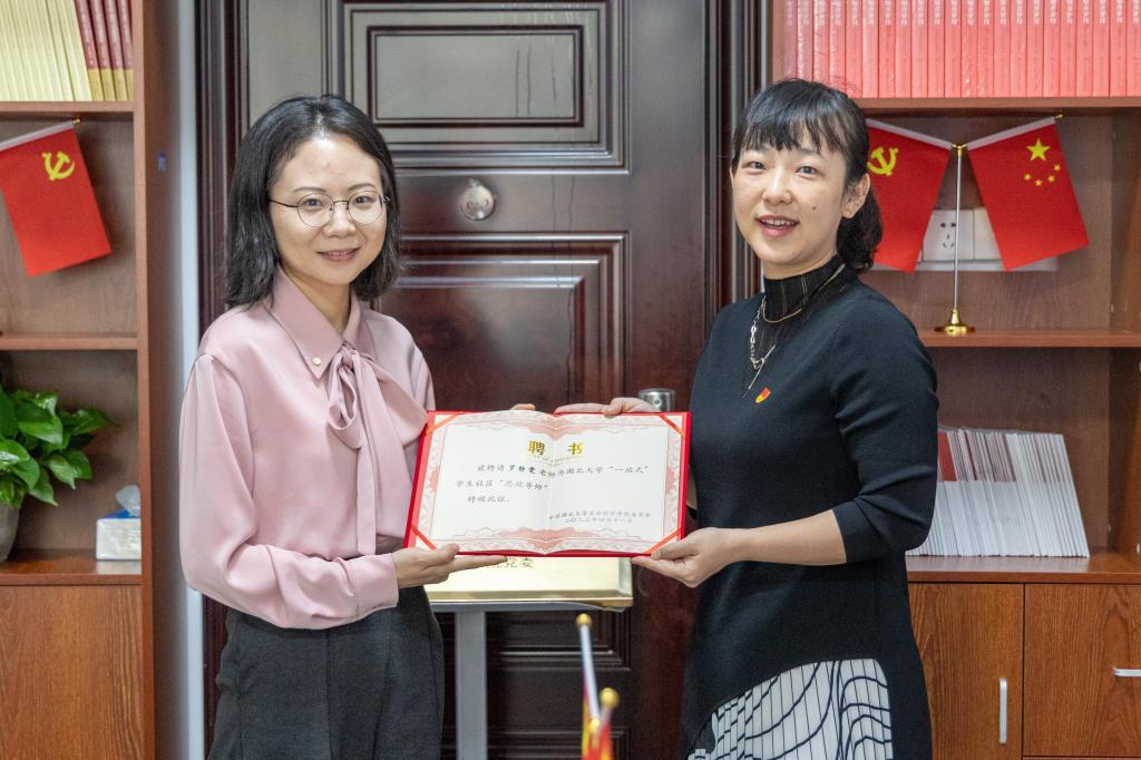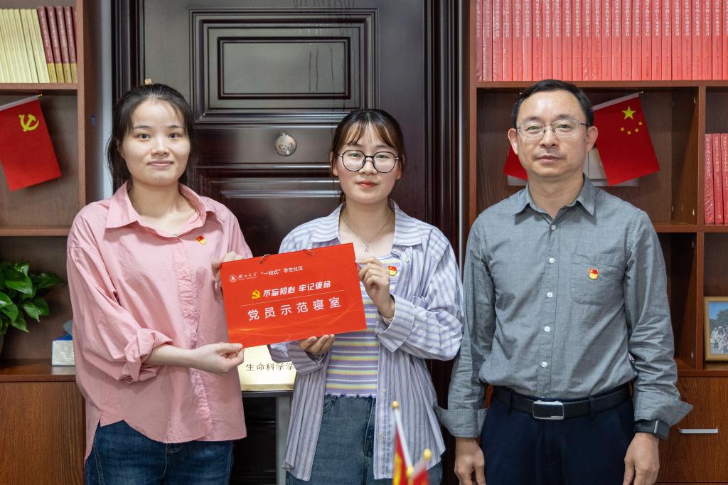 会上,学工部负责人为“思政导师”罗静雯颁发聘书,9428cn太阳集团党委负责人为党员示范寝室授牌。