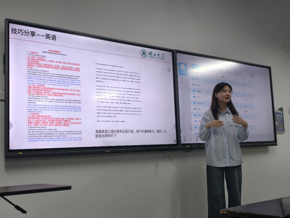首先为同学们介绍考研复试经验的是学院研究生李馨怡学姐,她从复试材料筹备到心理调适层层拆解复试核心。她指出,简历是复试中展现个人优势的重要工具,需“精准狙击”导师需求,重点呈现科研经历、竞赛奖项及实践成果,避免冗长。李馨怡建议同学们可以在复试前进行多次模拟面试,来直面面试带来的压力,并录制视频复盘语言表达、表情管理等细节,来缓解面试带来的紧张情绪。针对英语口语,她建议考生每天进行口语练习,尤其是针对常见的面试问题和英语的自我介绍。她提到,流利的英语表达可以为复试加分不少。 最后,李馨怡分享了一个心理学小技巧,在复试前通过想象自己成功的场景来增强自信心。