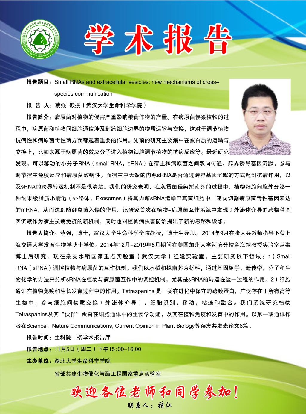 学术报告:Small RNAs and extracellular vesicles:new mechanisms of cross-species communication