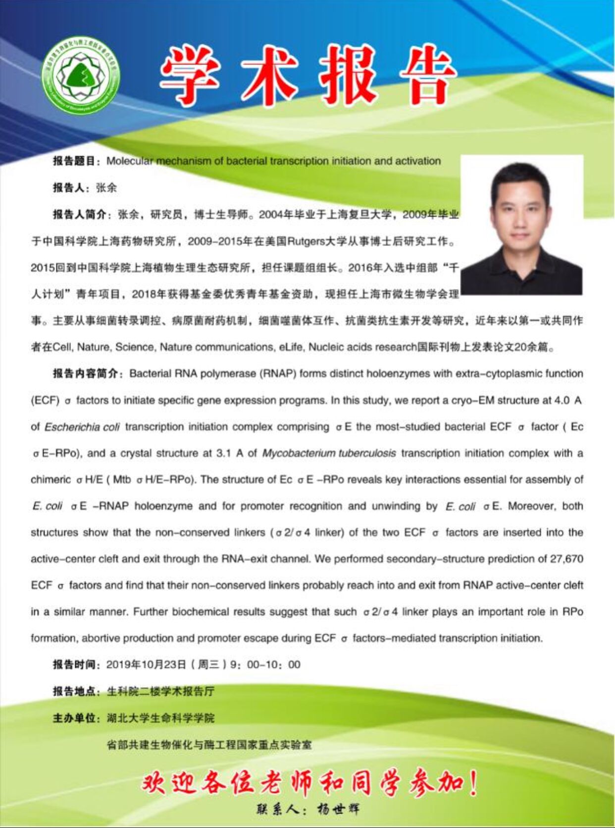 学术报告:Molecular mechanism of bacterial transcription initiation and activation