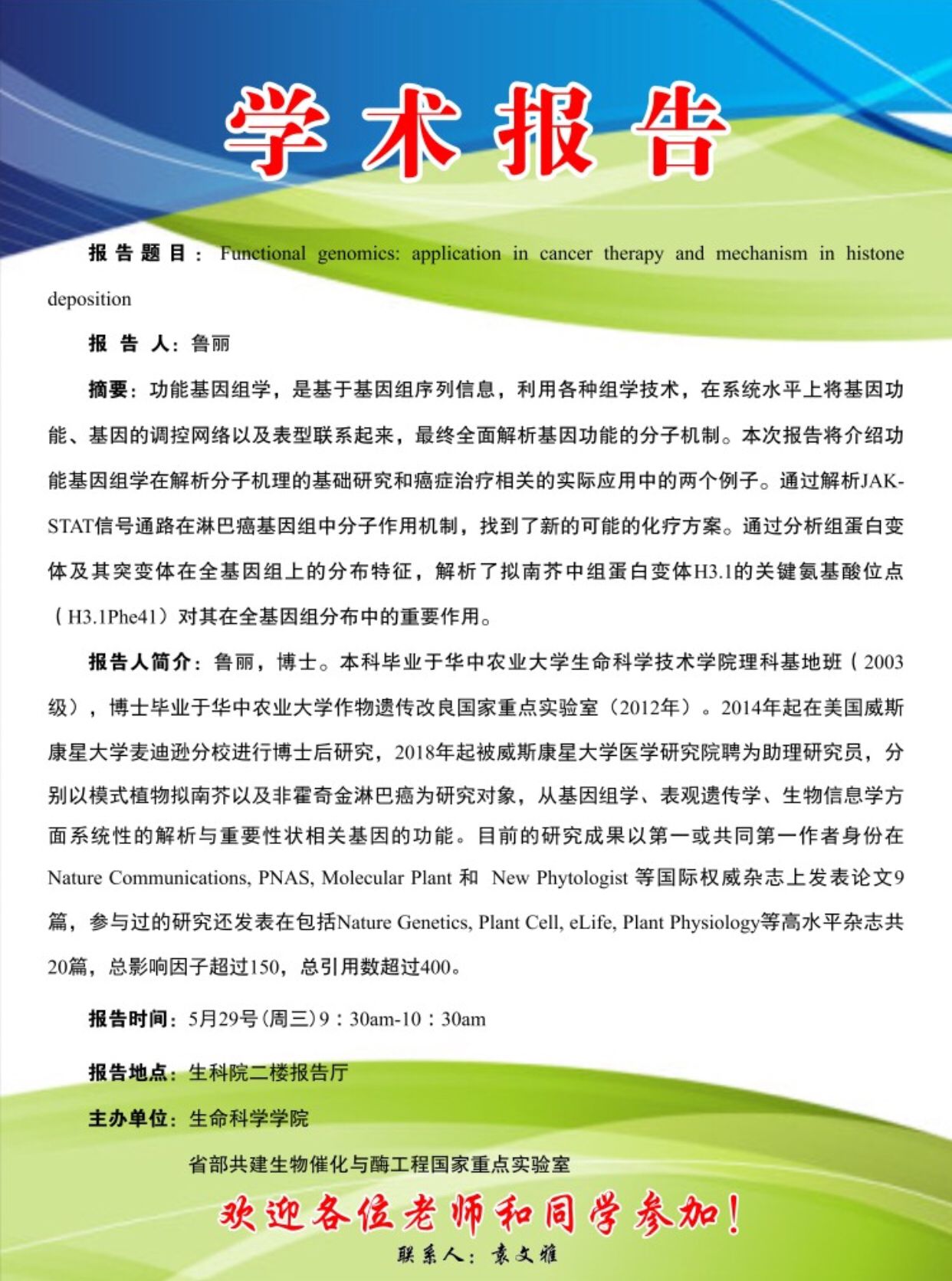 学术报告:Functional genomics :application in cancer therapy and mechanism in histone deposition