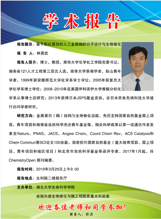 学术报告:基于肌红蛋白的人工金属酶的分子设计与生物催化