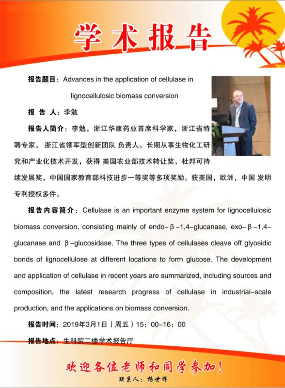 学术报告:Advances in the application of cellulase in lignocellulosic biomass conversion
