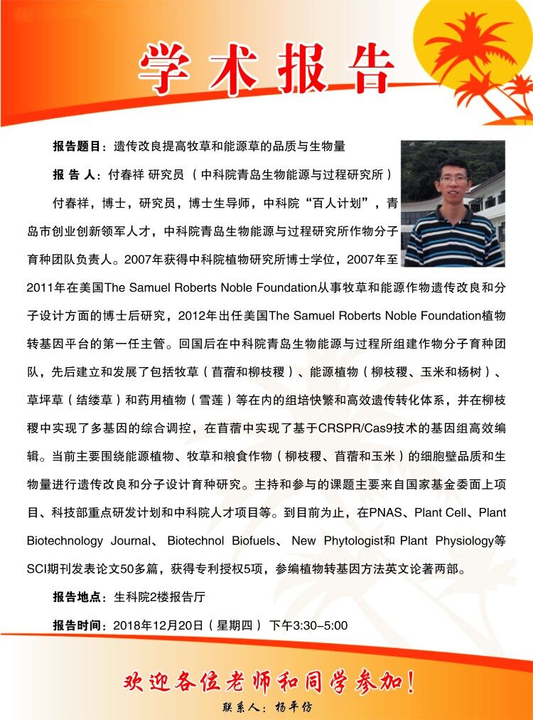 学术报告:遗传改良提高牧草和能源草的品质与生物量