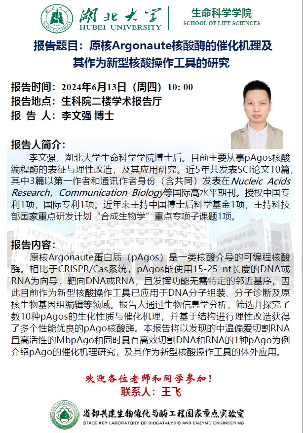 学术报告:原核argonaute核酸酶的催化机理及其作为新型核酸操作工具的研究