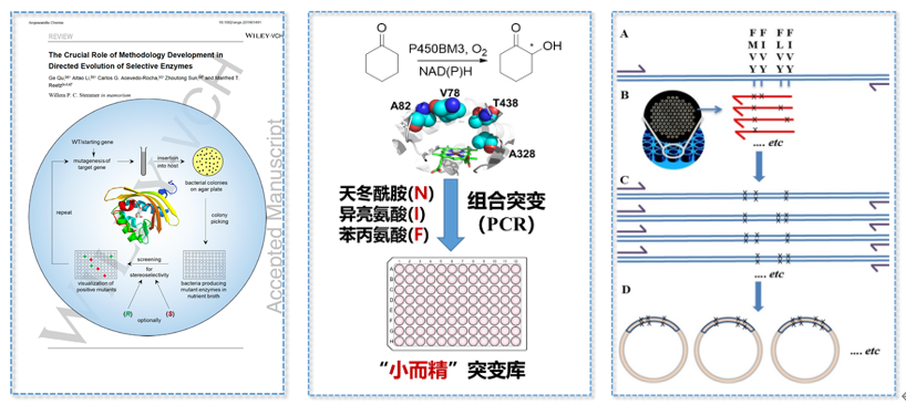 1. 酶定向进化方法开发:活性中心“精简”密码子饱和突变,体外非PCR依赖的基因文库构建和固相芯片基因合成法, “小而精” 且无偏好性组合基因文库的构建