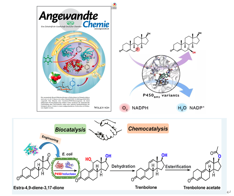 2. 人工酶元件的创制:细胞色素P450单加氧酶进行酶分子工程改造,揭示一种以苯为原料、基于细胞色素P450-BM3酶的一锅法合成对苯二酚的方法;实现了甾体底物C7β定向羟基化的挑战性反应,实现甾体药物群勃龙和醋酸群勃龙的化学-酶法合成。