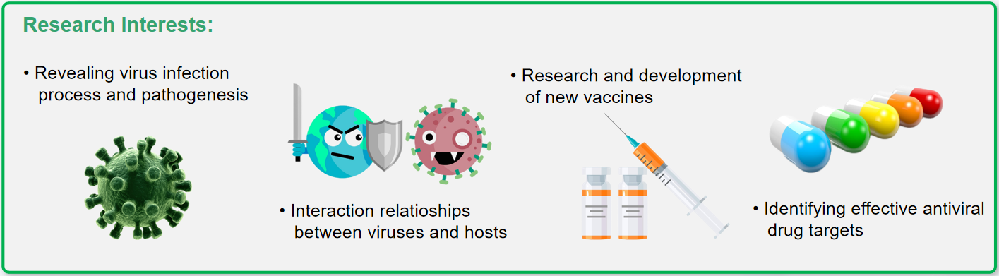 本团队聚焦于重要的人类和动物病毒(包括人副流感病毒、呼吸道合胞病毒、寨卡病毒、肠道病毒71型、新冠病毒、埃博拉病毒、尼帕病毒、乙型肝炎病毒等)的感染、复制与致病机制的研究,解析病毒在宿主细胞内的复制、组装、释放及病毒与宿主细胞的相互作用机制;结合结构生物学、生物信息学发现和鉴定新的抗病毒治疗靶点,在筛选传统抗病毒小分子药物的同时还开展包括纳米颗粒疫苗和RNA疫苗在内的多种新型预防和治疗性抗病毒药物的研发。