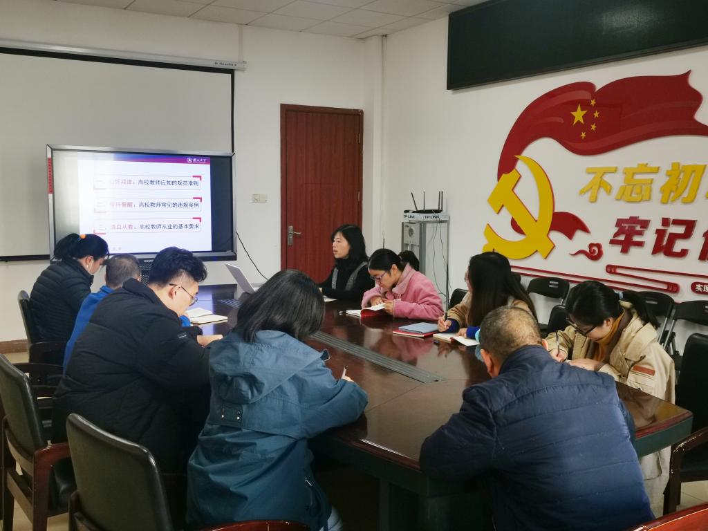 党日活动第二个环节,支部书记张黎主任结合实际案例,敲响了违反师德师风的行为警钟,让支部党员再次树牢教师德行的红线意识,涵养师德、铸造师魂,倾力做好立德树人的神圣事业。