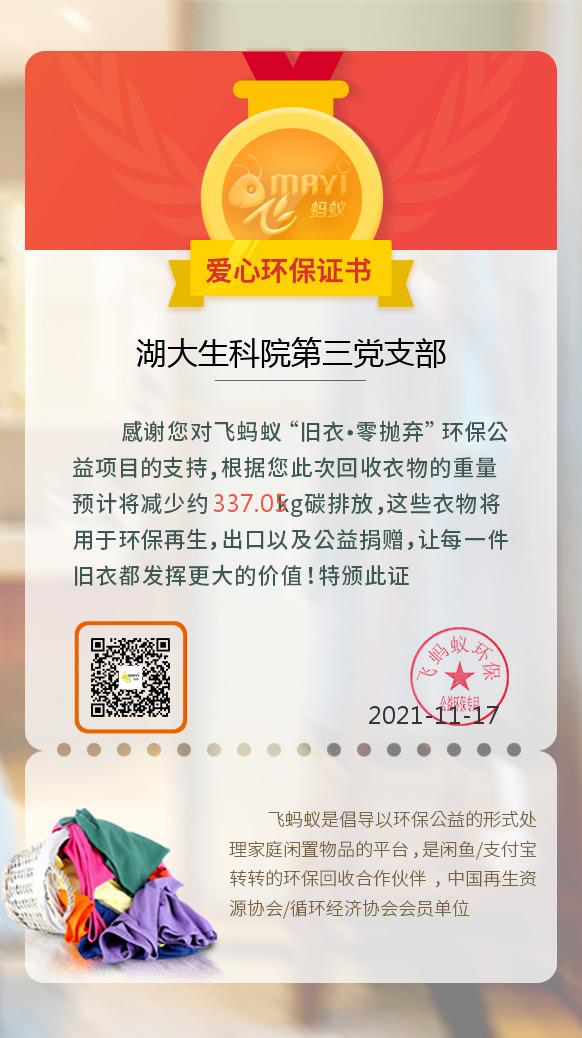 图为“飞蚂蚁”平台颁发的爱心环保证书平台以预约回收时间为准出具证书