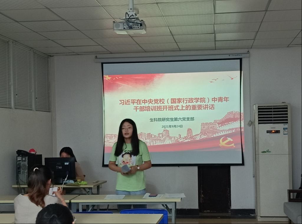 为持续推进党史学习教育走深走实,进一步激发党员的使命担当意识,2021年9月24日,我们党支部于生科院六报开展了学习“习近平在中央党校(国家行政学院)中青年干部培训班开班式上的重要讲话”主题党日活动。生科院研究生第六党支部全体党员参加了此次活动,本次活动由第六党支部书记张明佳主持。